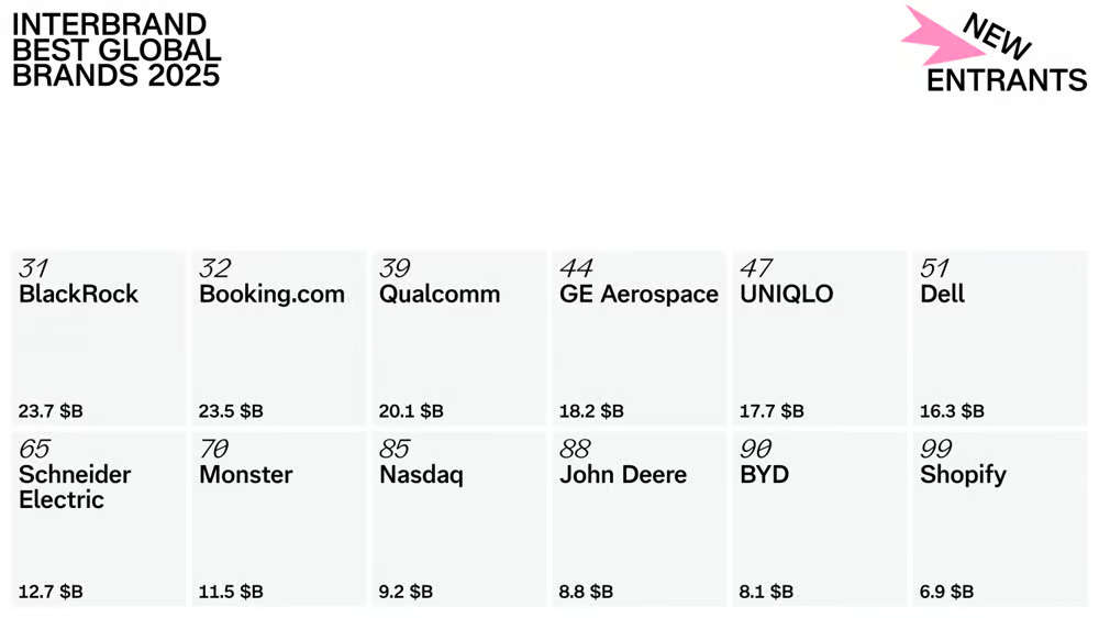 Song song đó, 2025 lại là một năm đầy biến động với sự xuất hiện của 12 thương hiệu mới – con số cao nhất kể từ khi Interbrand ra mắt BXH vào năm 2000. Danh sách này bao gồm: BlackRock, Booking.com, Qualcomm, GE Aerospace, UNIQLO, Dell, Schneider Electric, Monster, Nasdaq, John Deere, BYD và Shopify.